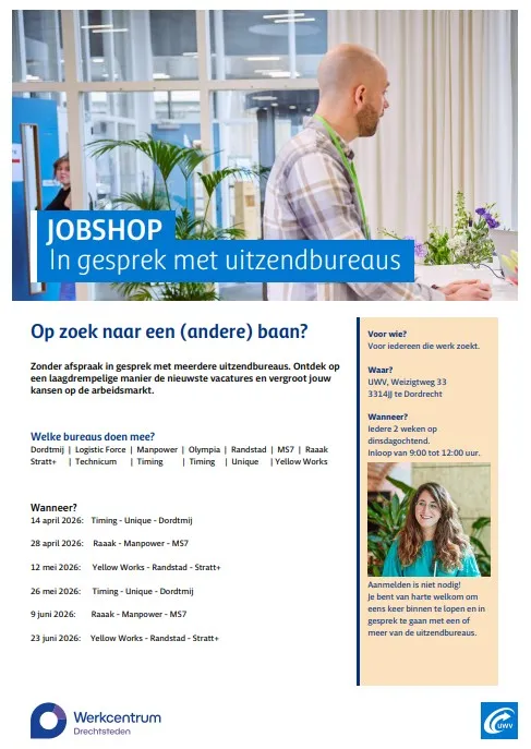 Kom langs voor een gesprek met een uitzendbureau. Op een makkelijke en toegankelijke manier maak je kennis met het huidige aanbod aan werk. Iedereen is welkom!
